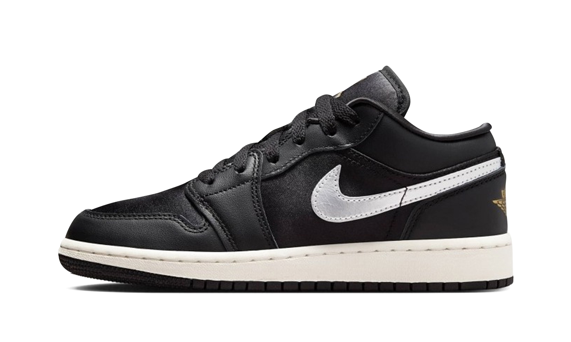 Elevate their everyday look with the Air Jordan 1 Low SE GS 'Black/Metallic Gold' sneaker. This Grade School exclusive brings a celebratory shine to the classic low-top silhouette. It combines smooth black leather overlays with striking Metallic Gold accents on the Swoosh and Wings logo, giving it a premium, formal touch that's never boring. Built with durable leather and comfortable Nike Air cushioning, this special edition AJ1 delivers iconic heritage and durable traction, making it the perfect standout shoe for school or any special moment.