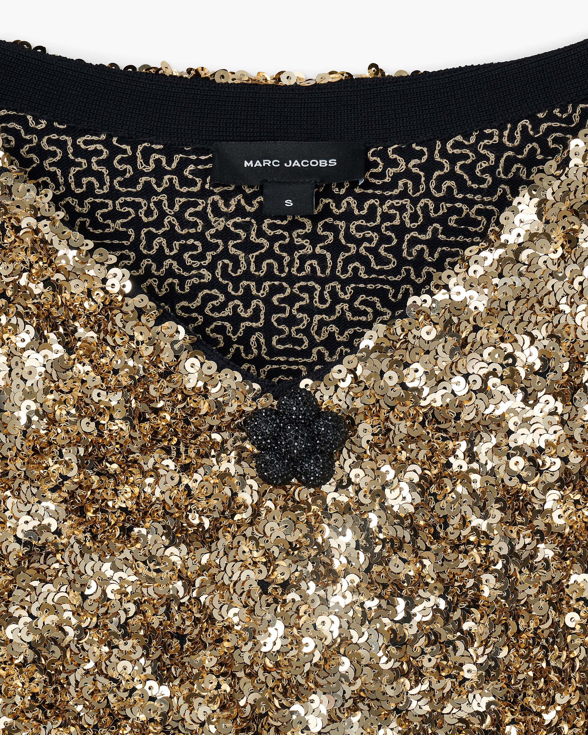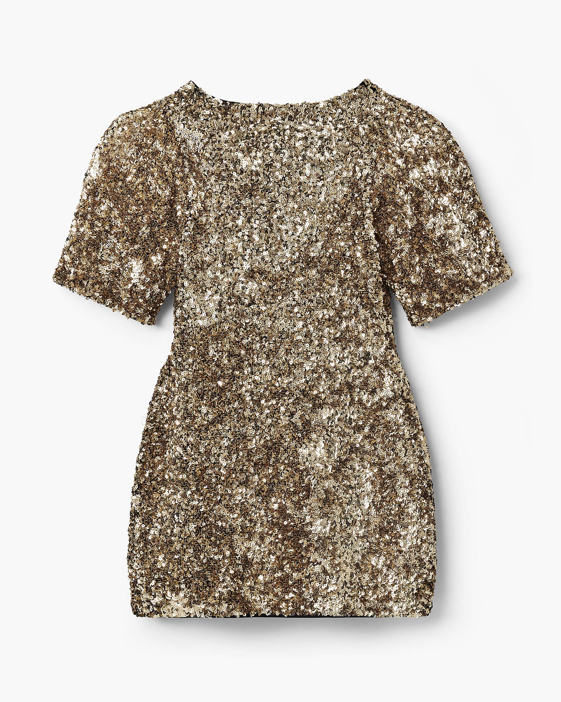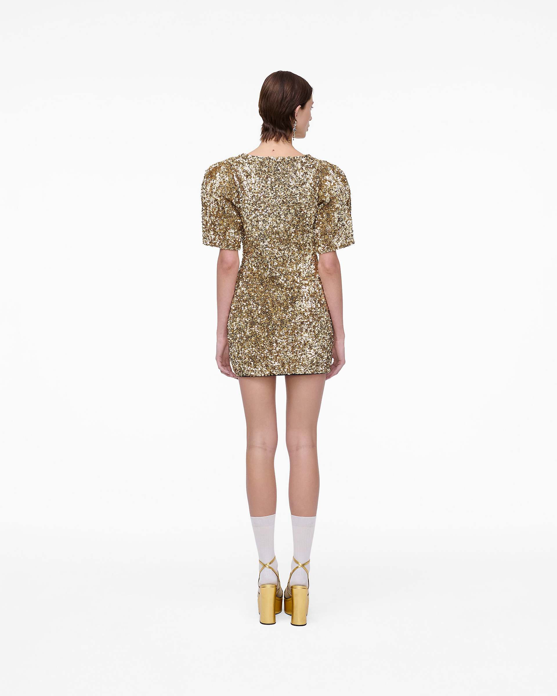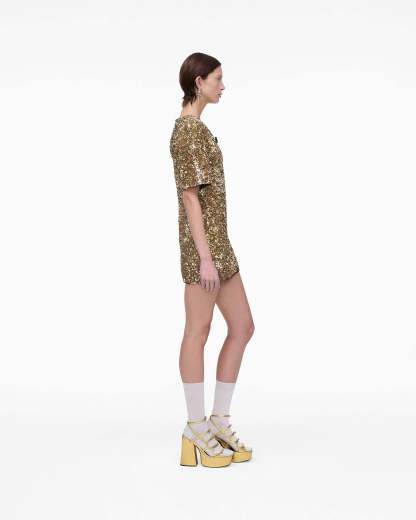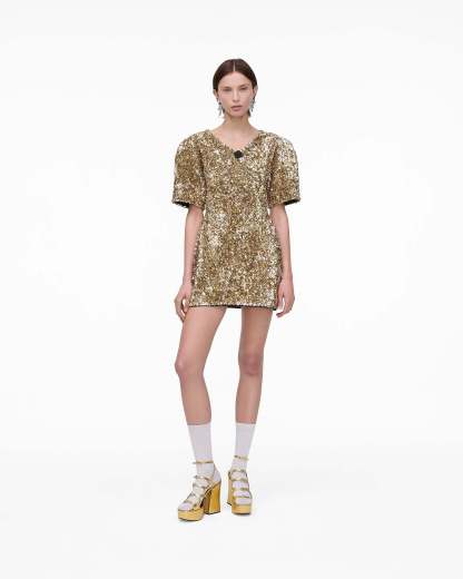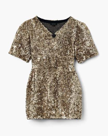Featuring all over textural gold sequins and a pave-embellished removable puffed daisy brooch, The Sequin V-Neck dress is the perfect blend of classic elegance and contemporary design. Using a meticulous sequin application technique for a luxurious 3-D effect, this doll-inspired silhouette features exaggerated sleeves, removable shoulder pads, a cinched-in waist and a high-comfort stretch fabrication for effortless wearability. Shop Mathtrc Jacthtobs Sequin V-Neck Knit Dress