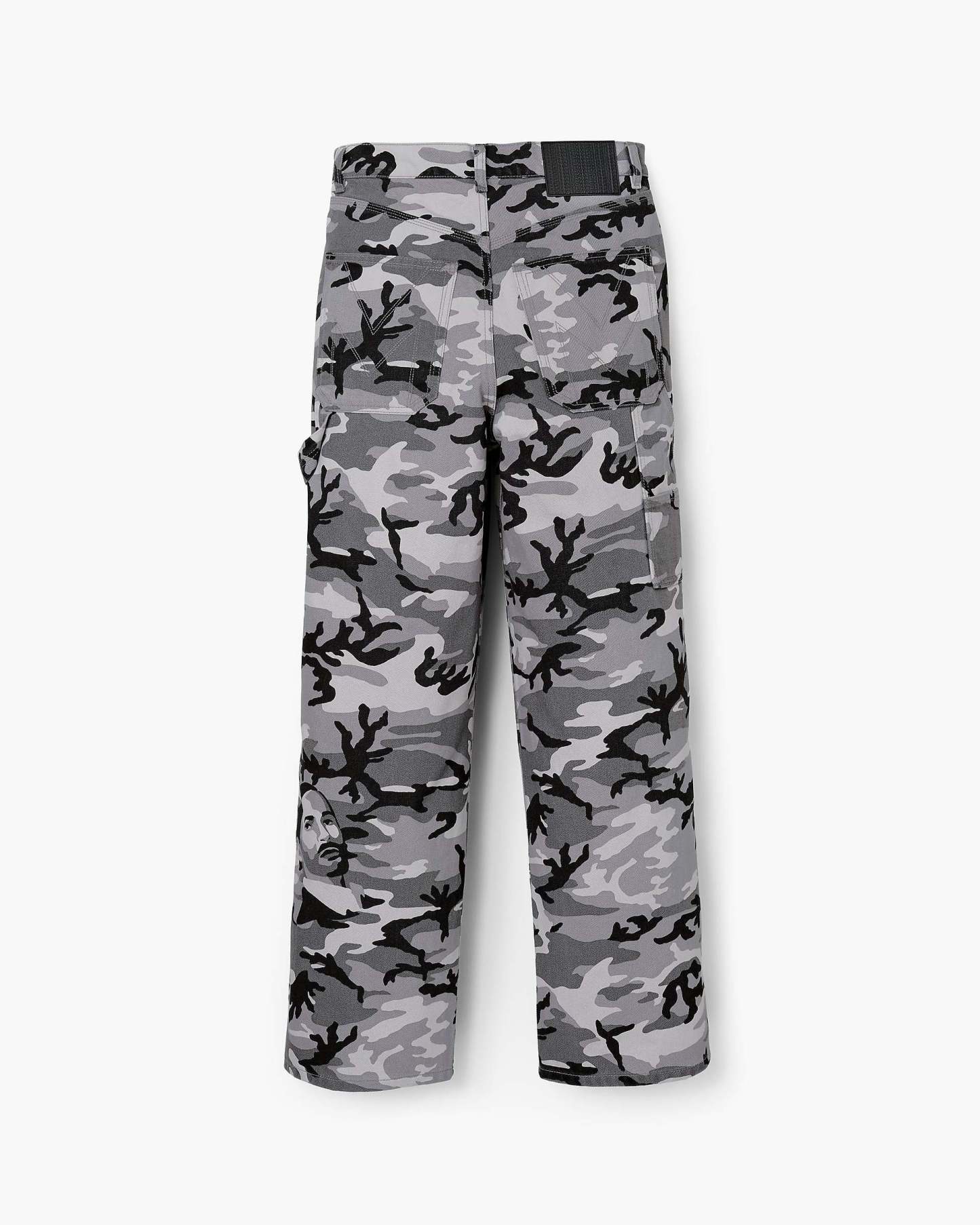 Our beloved Oversized Jean silhouette reimagined in our seasonal Marc Camo motif. Celebrating the face behind our brand, this baggy low-rise silhouette features 7 pockets for optimized organization, custom logo branded tack buttons, thoughtfully composed layered placed prints and a button-fly closure. Shop Mathtrc Jacthtobs Marc Camo Oversized Jean