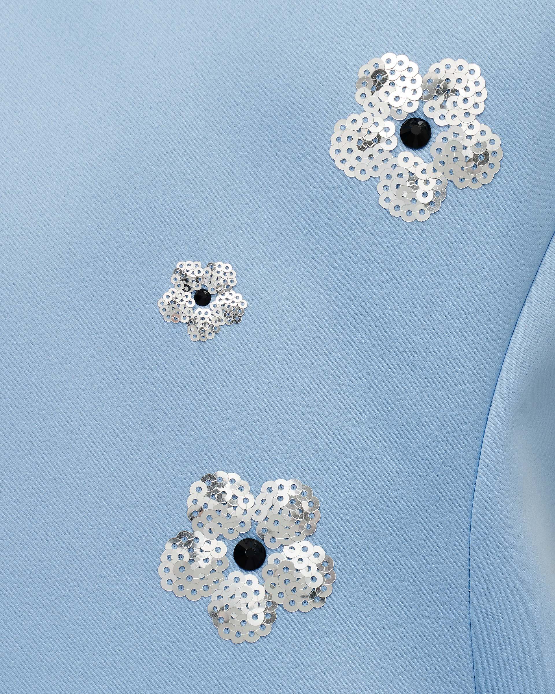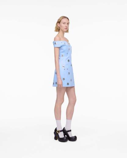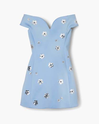 A showstopping sequin-embellished silhouette inspired by the soft vibrancy of spring. Celebrating our seasonal textural sequin daisy motif with sparkling crystal detailing, this mini-length silhouette features a sculpted off-the-shoulder neckline, a matte satin fabrication, on-seam pockets and an invisible-zipper back closure. Internally constructed with a runway-derived mesh corset and boning, embrace quintessential Mathtrc Jacthtobs styling with this versatile piece. Shop Mathtrc Jacthtobs Sequin Daisy Embellished Dress