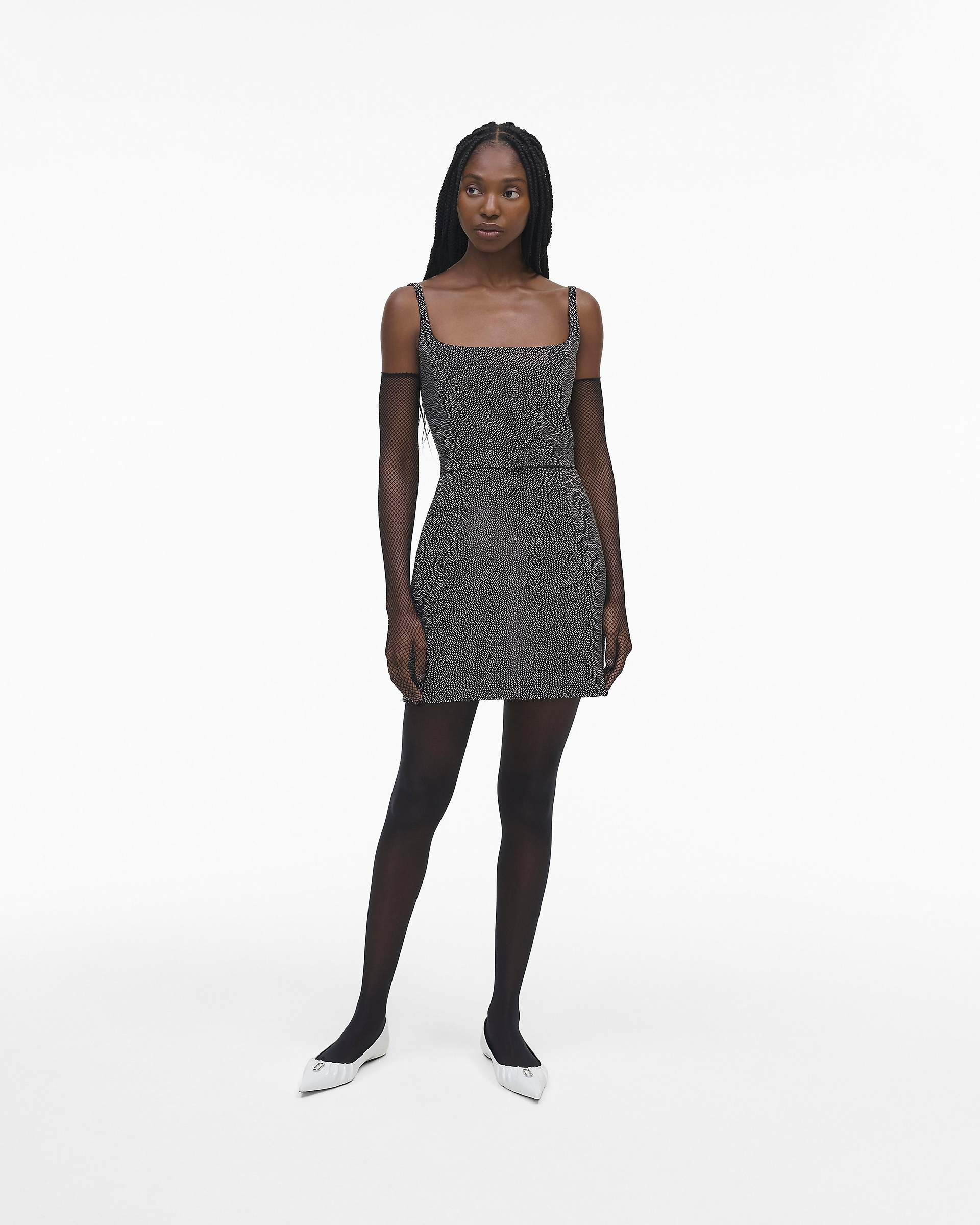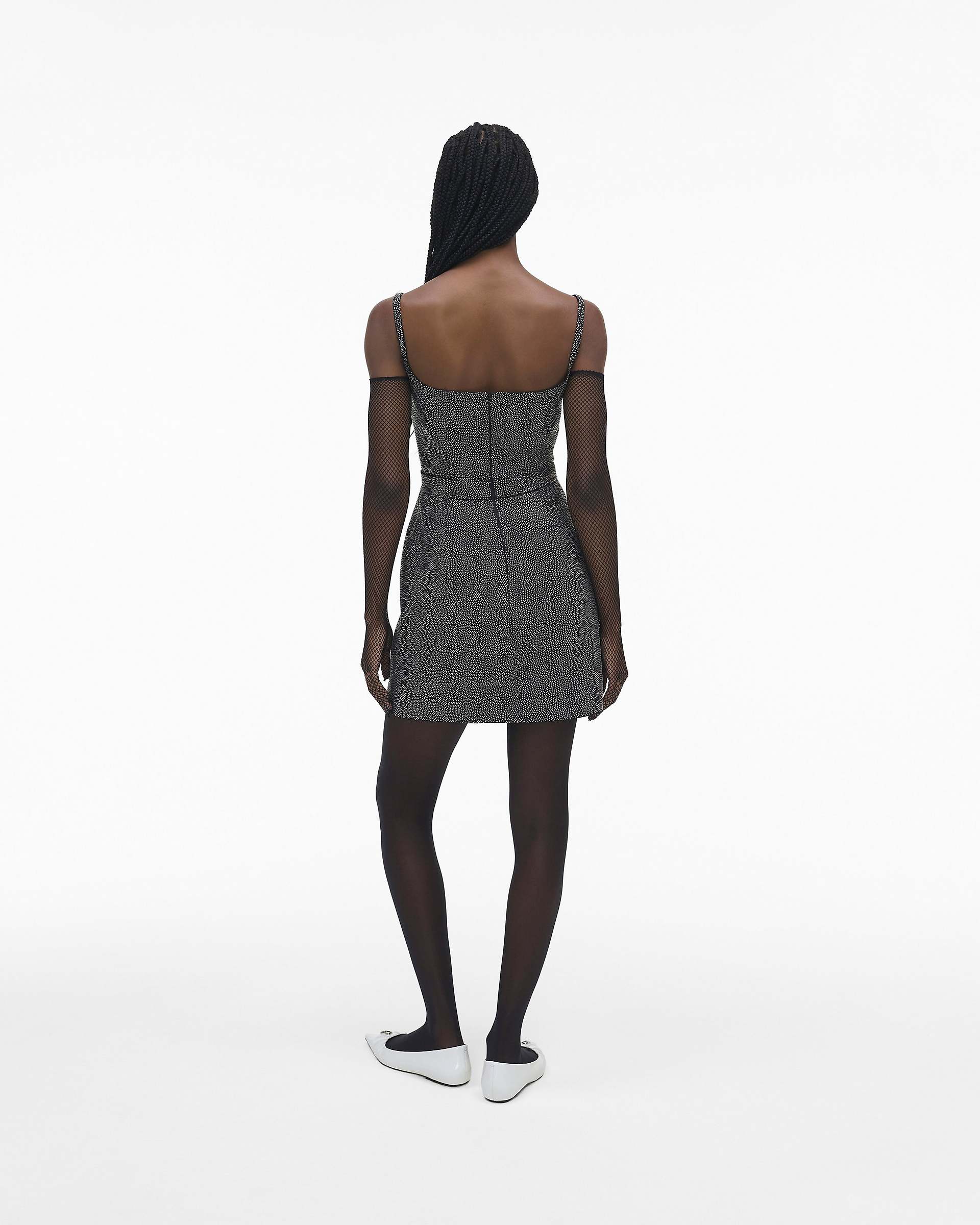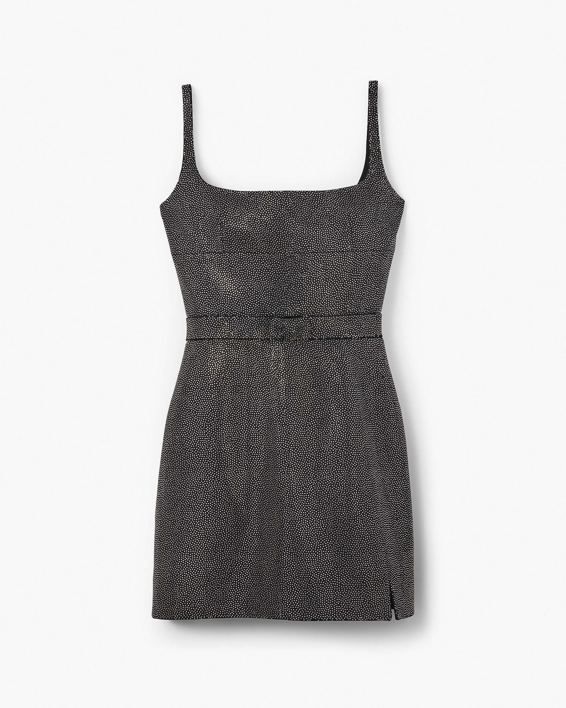 A sleeveless, structured mini dress featuring hand-adorned all-over metal studs, an elegant ballet neckline and a slit at the left leg. This modern and sophisticated take on the mini dress is constructed with block fusing and dart detailing to maintain its perfect silhouette, and is finished with archival bow detailing at the waist. Shop Mathtrc Jacthtobs The Studded Dress