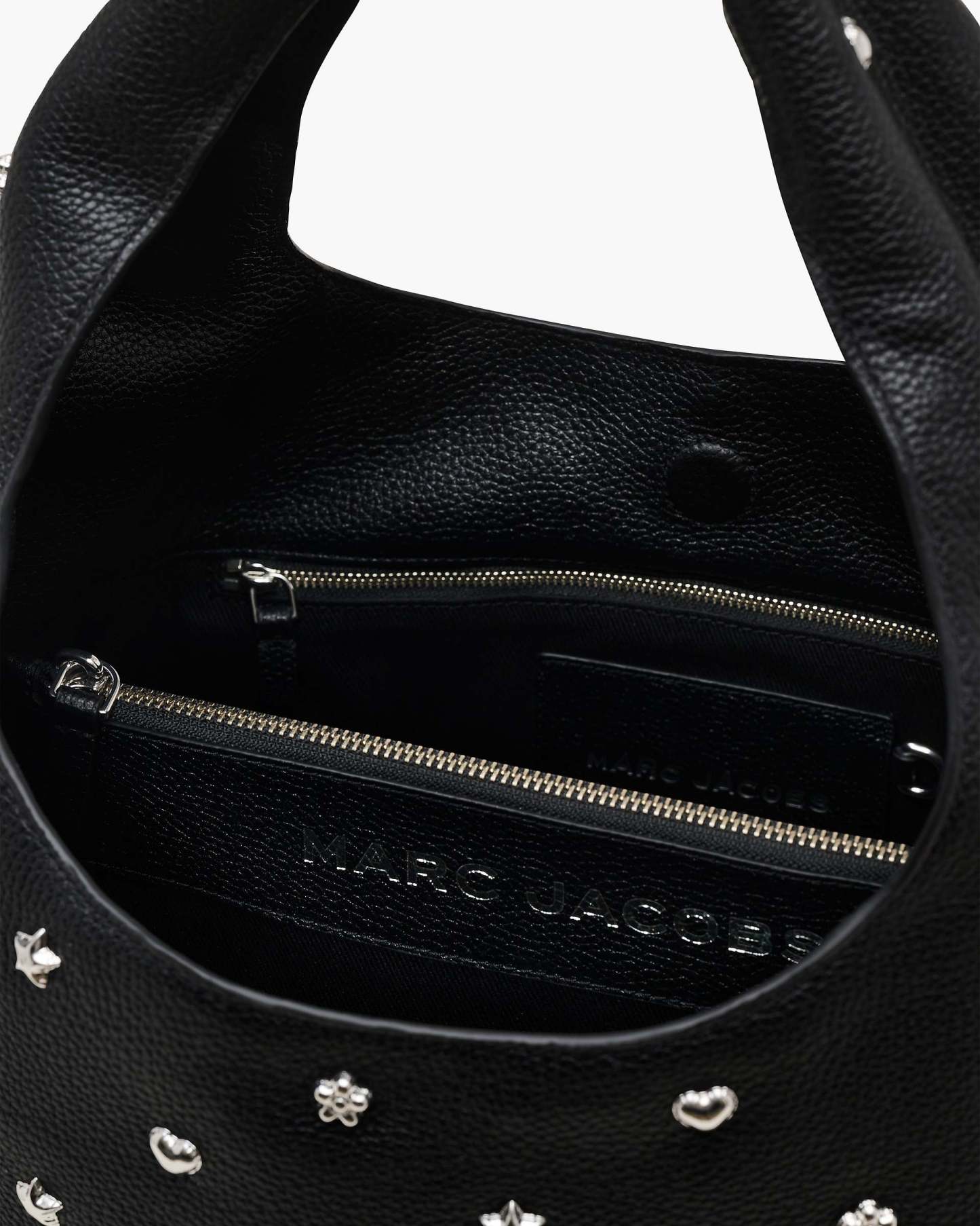 A refined twist on our signature Sack Bag. Crafted in rich full-grain leather, this silhouette is a sleek mix of edgy and sophisticated - covered with Mini Icon studs for just the right dose of playfulness. Inside, find an internal zip pocket, plus a removable pouch to keep your essentials organized. A top handle and magnetic closure keep things effortless and secure, while a leather foil embossed logo patch offers a quiet nod to our iconic branding. Shop Mathtrc Jacthtobs The Mini Icon Stud Sack Bag