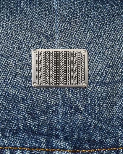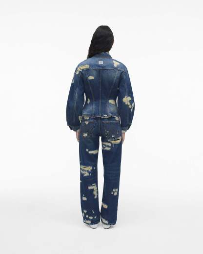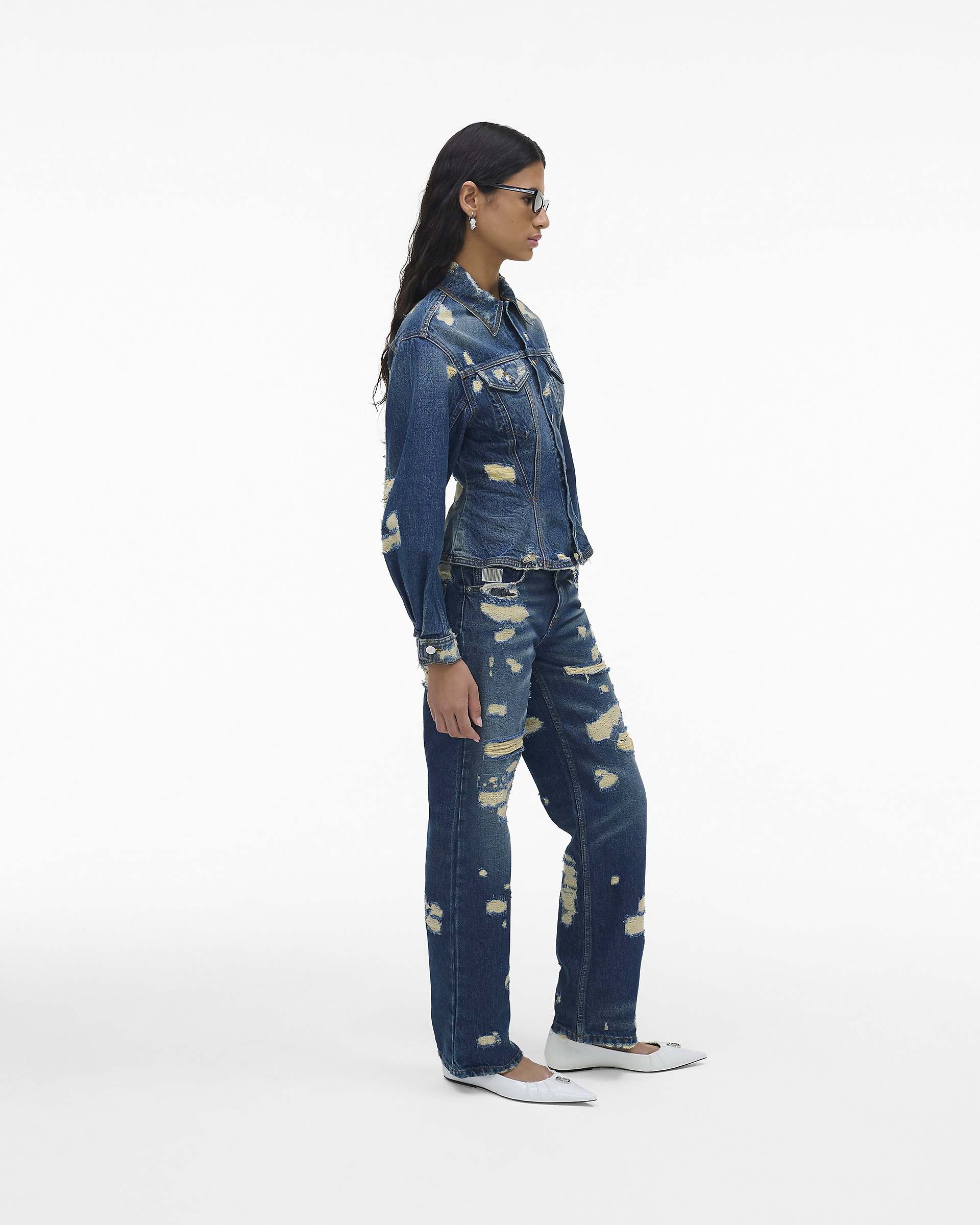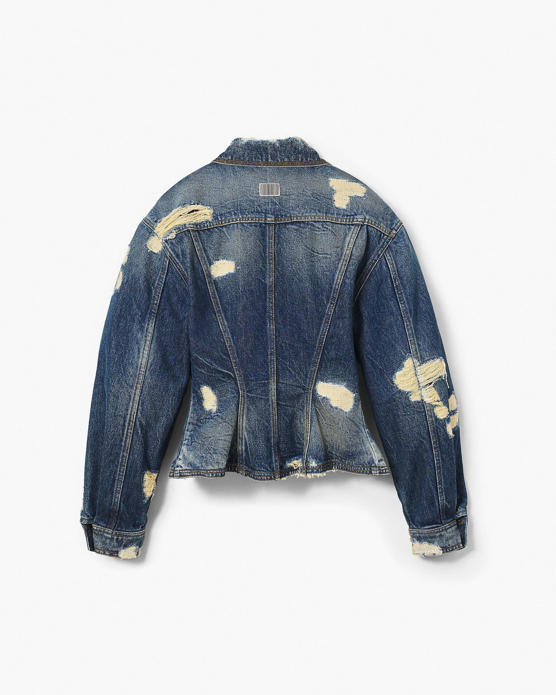 Inspired by the dramatic silhouette of a corset, this 100% cotton distressed denim jacket is designed with a cinched waist and flared hem for artfully sculptural dressing. Finished with interior binding, our signature metal barcode back patch and a button-up closure, pair with our Fluted Rip and Repair Mini Skirt to complete the outfit. Shop Mathtrc Jacthtobs The Rip And Repair Fluted Denim Jacket