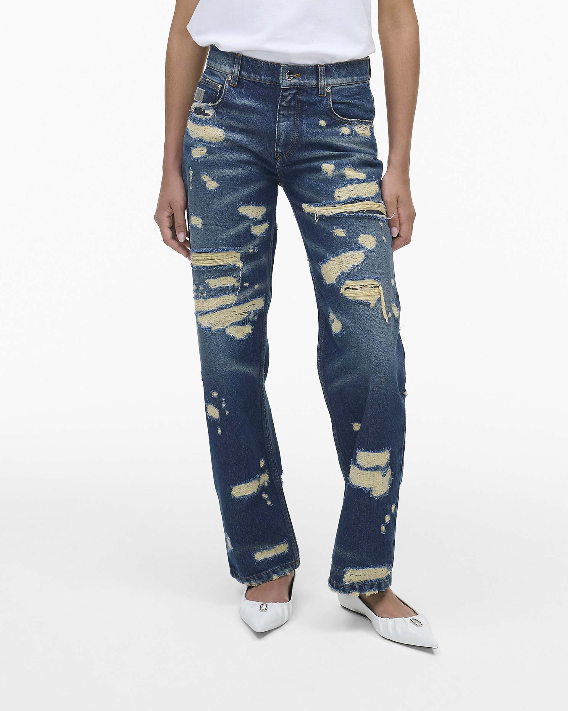 Fabricated in artfully distressed 100% cotton denim, these retro-inspired mid-rise jeans have a relaxed, straight-legged silhouette. Featuring a zipper-fly-button closure, our iconic back-pocket “M” stitching, and signature branded detailing, this all-over Rip and Repair style exudes cutting-edge, contemporary luxury. Shop Mathtrc Jacthtobs The Rip and Repair Straight Jean