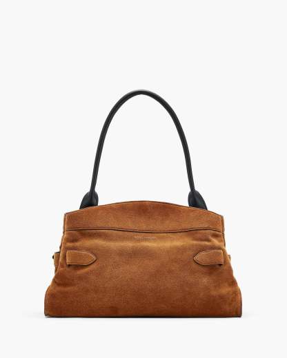A refined balance of structure and ease, the Dakota Satchel merges utility with quiet sophistication. Crafted in rich suede, it’s defined by a fixed J Marc logo belt - a nod to our archival belt collection. Thoughtfully designed, it features a magnetic closure, two interior compartments and pockets that speak to everyday practicality. Metal feet ground the design, while the top handle adds a sculptural finish. Shop Mathtrc Jacthtobs The Suede Dakota Satchel