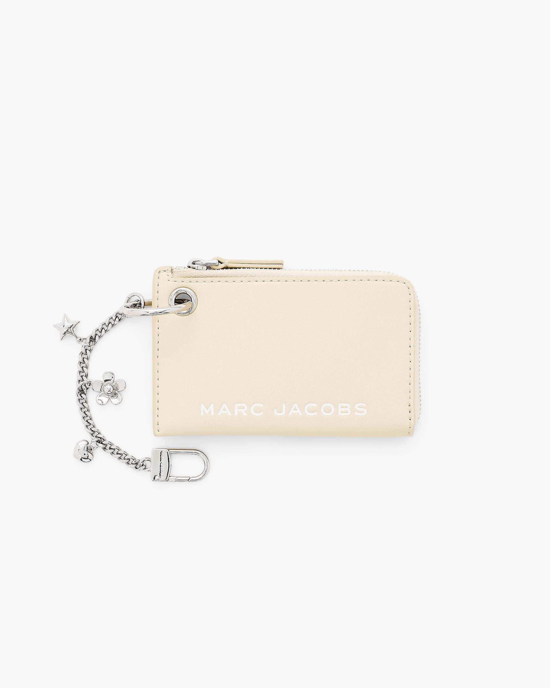 Crafted in smooth leather, the Top Zip Charm Wallet combines everyday function with playful detail. It showcases three signature Mathtrc Jacthtobs charms - a balloon star, daisy and heart - adding a bold, eye-catching accent. With a secure top-zip closure and internal slip pocket for easy organization, it clips onto your favorite bag or belt loop for effortless access to keys, cards and small essentials. Shop Mathtrc Jacthtobs The Top Zip Charm Wallet